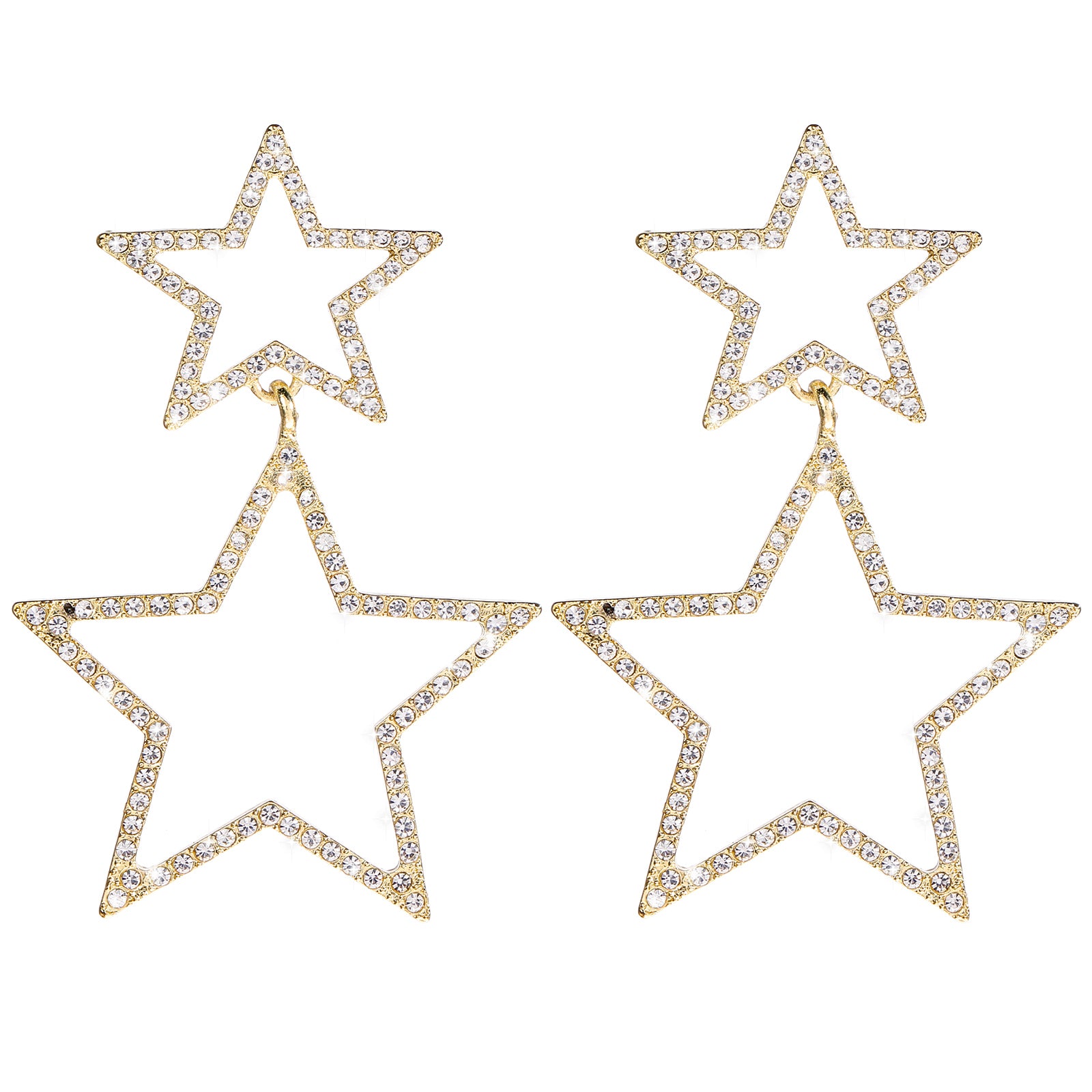 Star Earrings, Gold Star Earrings Dangle Glitter Star Rhinestone Earrings for Women Hollow Big Double Star Hoop Earrings Stylish Accessories for Women Girls Birthday Christmas Party Festival Daily