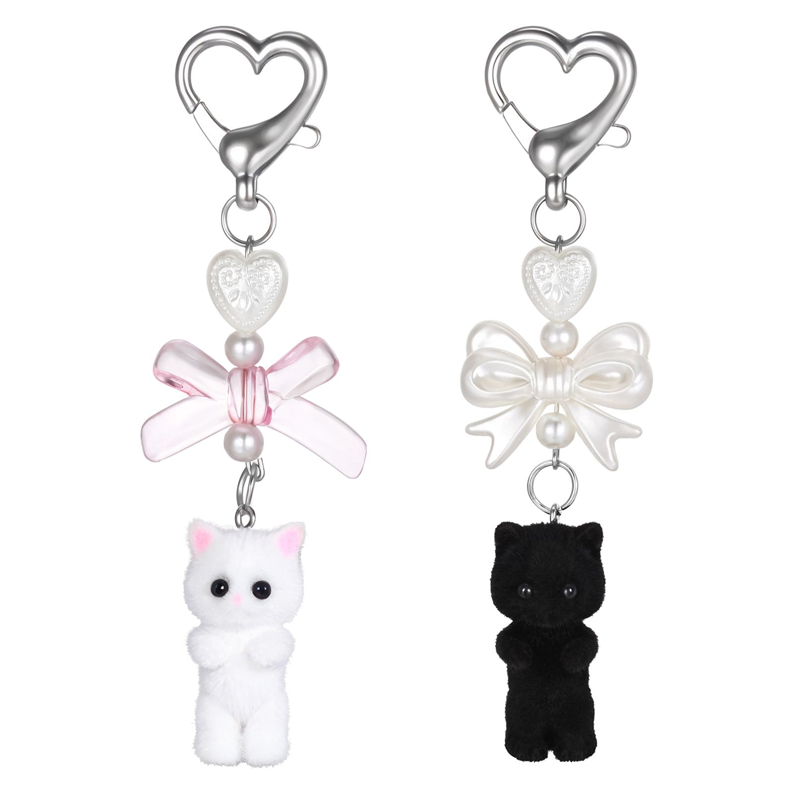 SynHHergyx 2 PCS Cute Cat Keychain, Fuzzy White and Black Cat Keychain Purse Charms, Aesthetic Y2k Keychain Heart Bow Pendent Cat Decor Cat Loves Cat Keychains for Women Girls Kawaii Cat Bag Charm
