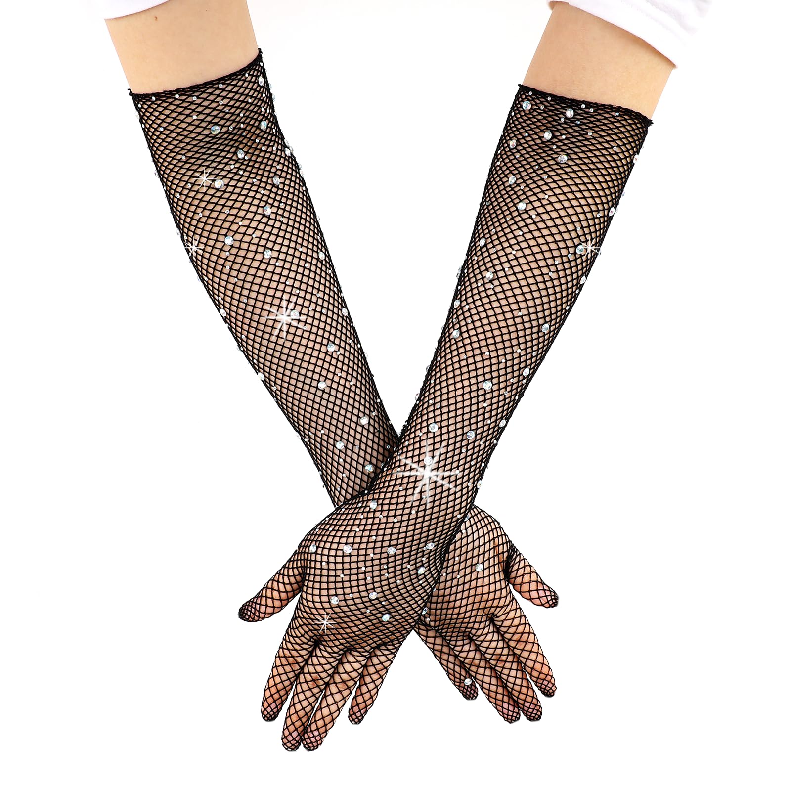 Women Rhinestone Fishnet Gloves Sparkly Gloves, Rhinestone Long Fishnet Gloves, Sheer Rhinestone Gloves Women Long Gloves, Mesh Glitter Gloves, Sheer Bridal Gloves Wedding Gloves(1 Pair Black)