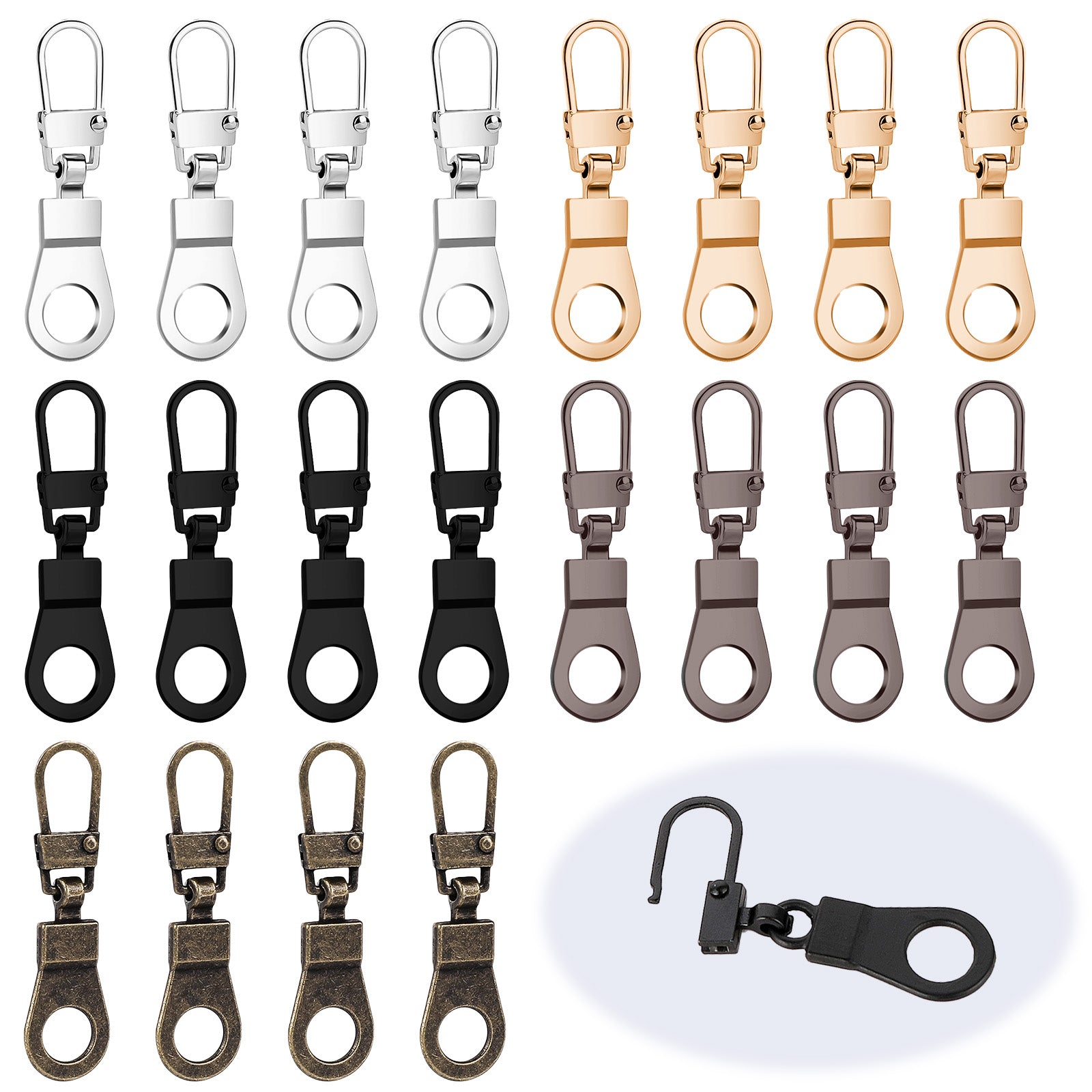 Zipper Pull Replacement, 20 Pcs Detachable Zipper Pulls Metal Zipper Tab Zipper Repair Kit for Clothing Jacket Boots Coat Luggage Suitcase Backpack (Black, Silver, Gold, Matte Black, Copper)