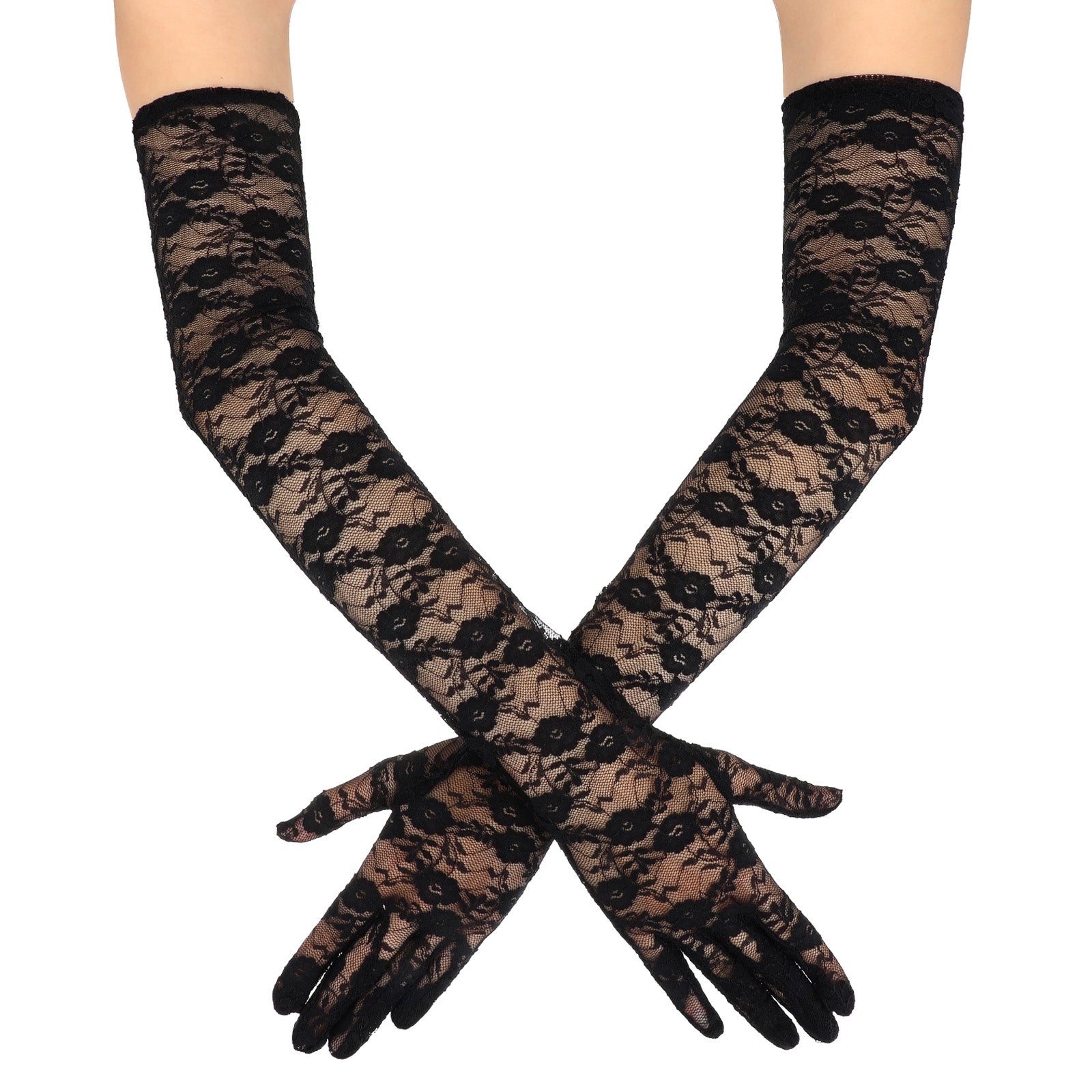 Zyghjort Long Black Gloves Black Lace Gloves Women, Elegant Tea Party Long Elegant Opera Lace Glove Floral Pattern Opera Glove Arm Elbow Length for Formal Dress Cocktail Parties Costume